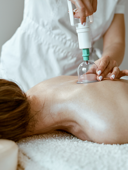 La terapia con ventosas utiliza vasos de vidrio o plástico que se colocan sobre la piel para crear una presión negativa o succión y ayudar a liberar adherencias fasciales y promover la circulación sanguínea. Al crear espacio para el flujo sanguíneo y linfático, las ventosas ayudan a relajar los músculos tensos y promueven la curación al "mover y succionar sangre". A su vez, se fuerza la entrada de nutrientes frescos a la musculatura y los tejidos. Puede resolver lesiones crónicas a largo plazo, músculos doloridos y puede ayudar a acelerar el curso de resfriados y gripes. Dependiendo de la afección específica, las ventosas pueden dejarse fijas sobre el cuerpo durante varios minutos o pueden moverse por una zona más grande del cuerpo.